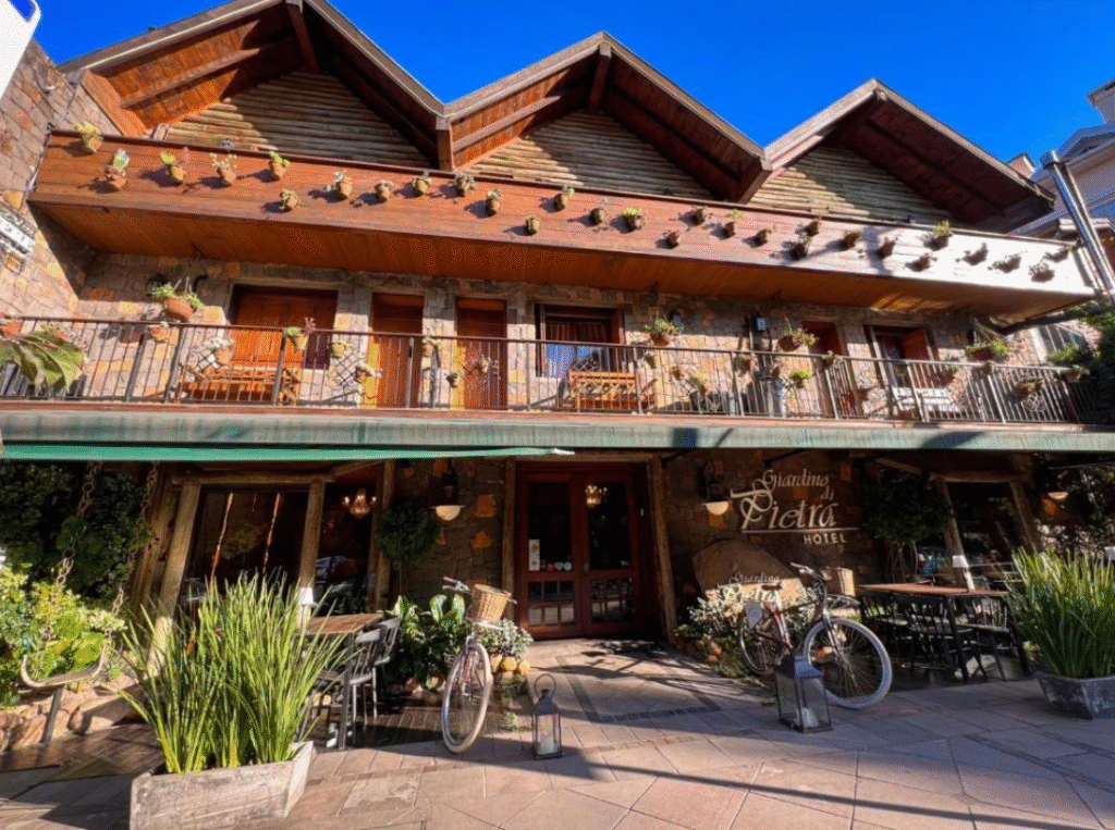 Um dos destaques do Giardino Di Pietra é a área de estar ao ar livre cercada por jardins, ideal para momentos relaxantes durante a lua de mel. O hotel também oferece buffet de café da manhã completo, servido diariamente, além de aluguel de bicicletas para explorar Gramado de forma leve e romântica.