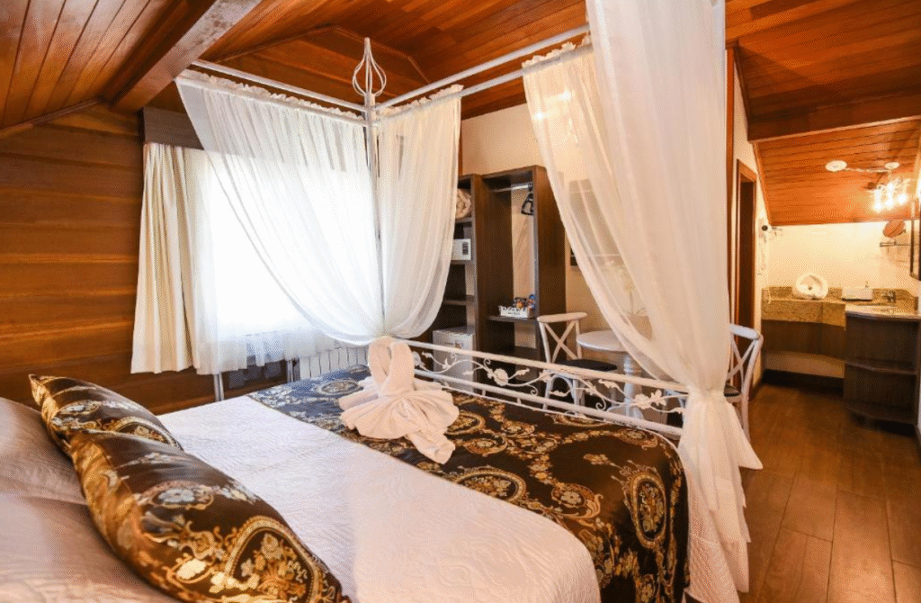 Já a região do Lago Negro é ideal para casais que priorizam sossego, contato com a natureza e experiências mais intimistas. Apesar de ser um pouco mais afastada do centro, concentra ótimos hotéis para lua de mel em Gramado, muitos deles com banheira de hidromassagem, vista para áreas verdes e clima perfeito para momentos a dois.