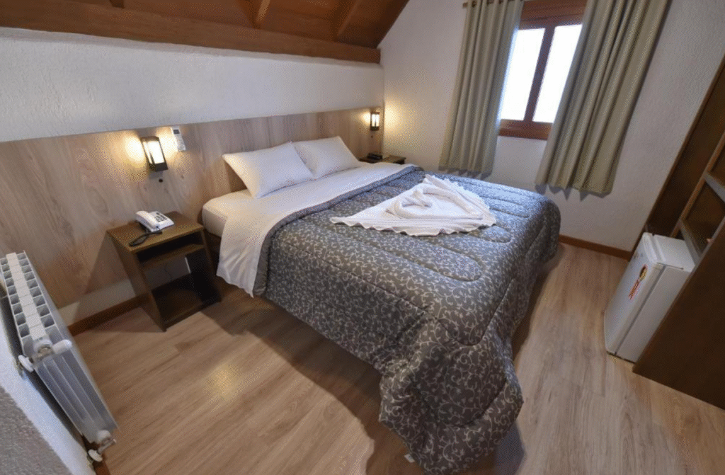 Os quartos são confortáveis e bem equipados, com ar-condicionado, TV de tela plana, mesa de trabalho e banheiro privativo com chuveiro, produtos de banho gratuitos e secador de cabelo. A combinação de design moderno e atmosfera acolhedora torna a estadia ainda mais especial para quem busca hotéis para lua de mel em Gramado com alto padrão de conforto.