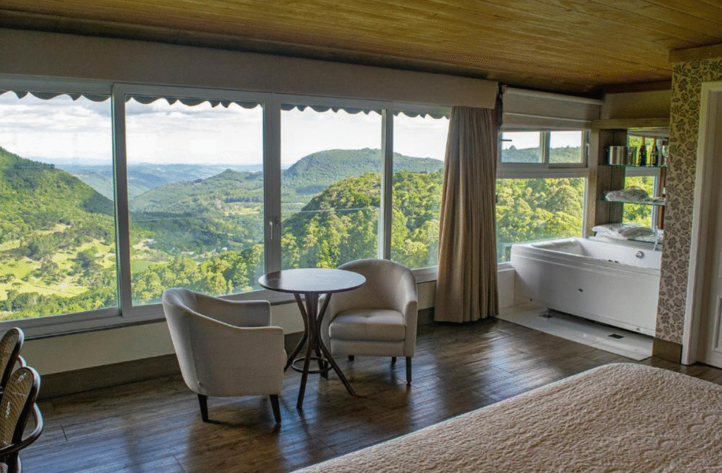 Em Gramado, é fácil encontrar hotéis para lua de mel com hidromassagem no quarto, muitos deles com lareira, vista para áreas verdes ou para o Vale do Quilombo, além de decoração sofisticada e iluminação aconchegante. A jacuzzi privativa permite momentos de relaxamento a dois, seja após um dia de passeios pela cidade ou durante noites frias típicas da região, tornando a experiência ainda mais memorável.