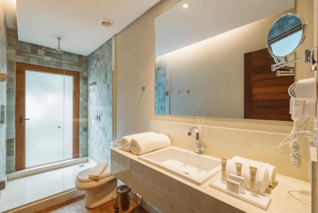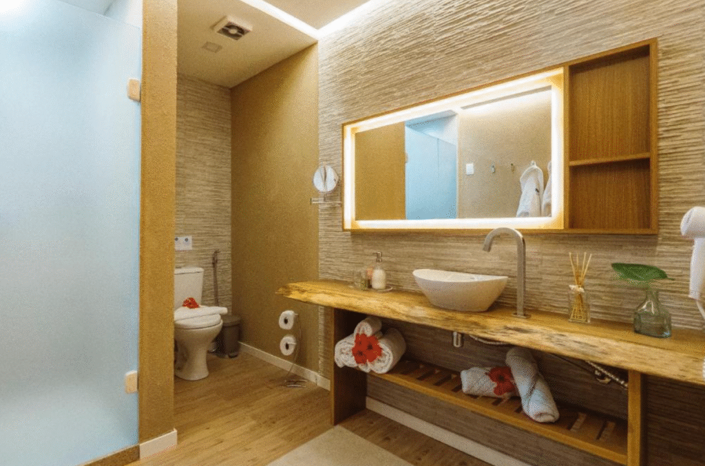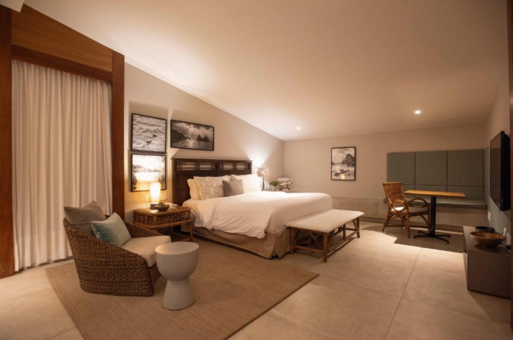 Em Fernando de Noronha, as pousadas de luxo se destacam por suítes amplas e sofisticadas, muitas com varanda, vista para o mar, piscina ou jacuzzi privativa. A decoração costuma valorizar elementos naturais, como madeira e fibras, combinados a um design elegante e contemporâneo. Amenities premium, enxoval de alta qualidade e tecnologia moderna garantem uma estadia confortável e refinada em meio ao paraíso.